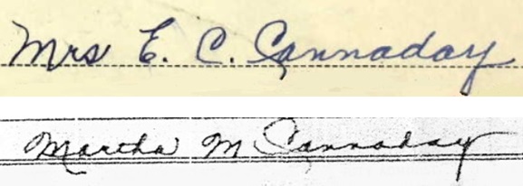 Martha had lovely penmanship. She never remarried and was Mrs. E. C. Cannaday until the day she died (top, 1946; bottom 1956).