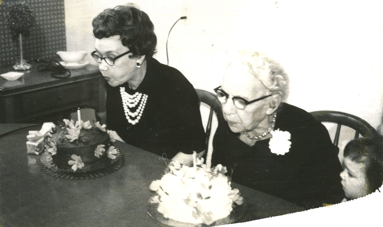 Martha (age 81) and her daughter-in-law Ruby celebrate their shared birthday, April 6, 1965, with great-granddaughter Terri looking on.