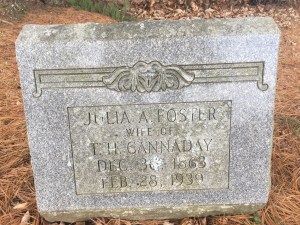 In 1875 William died, leaving his son Asa to run the Foster farm. Four years later, on October 12, 1879, Julia married 26-year-old Tazwell Howard Cannaday. She was 15 years old. The same year that Tazwell and Julia married, Tazwell’s father died. In the 1880 census, Tazwell and his young bride lived with Tazwell’s mother and his four youngest siblings. Tazwell was head of household and owned the farm. In a local directory, he was listed as one of the principal farmers in Pizarro (a community near Little River), as was Julia’s brother, Asa. Julia’s father had been a minister in the M.E. Church in North Floyd, and Julia and Tazwell, along with Julia’s siblings, were some of the original members of two early Methodist congregations that later combined to form the still-existing Stonewall Church.